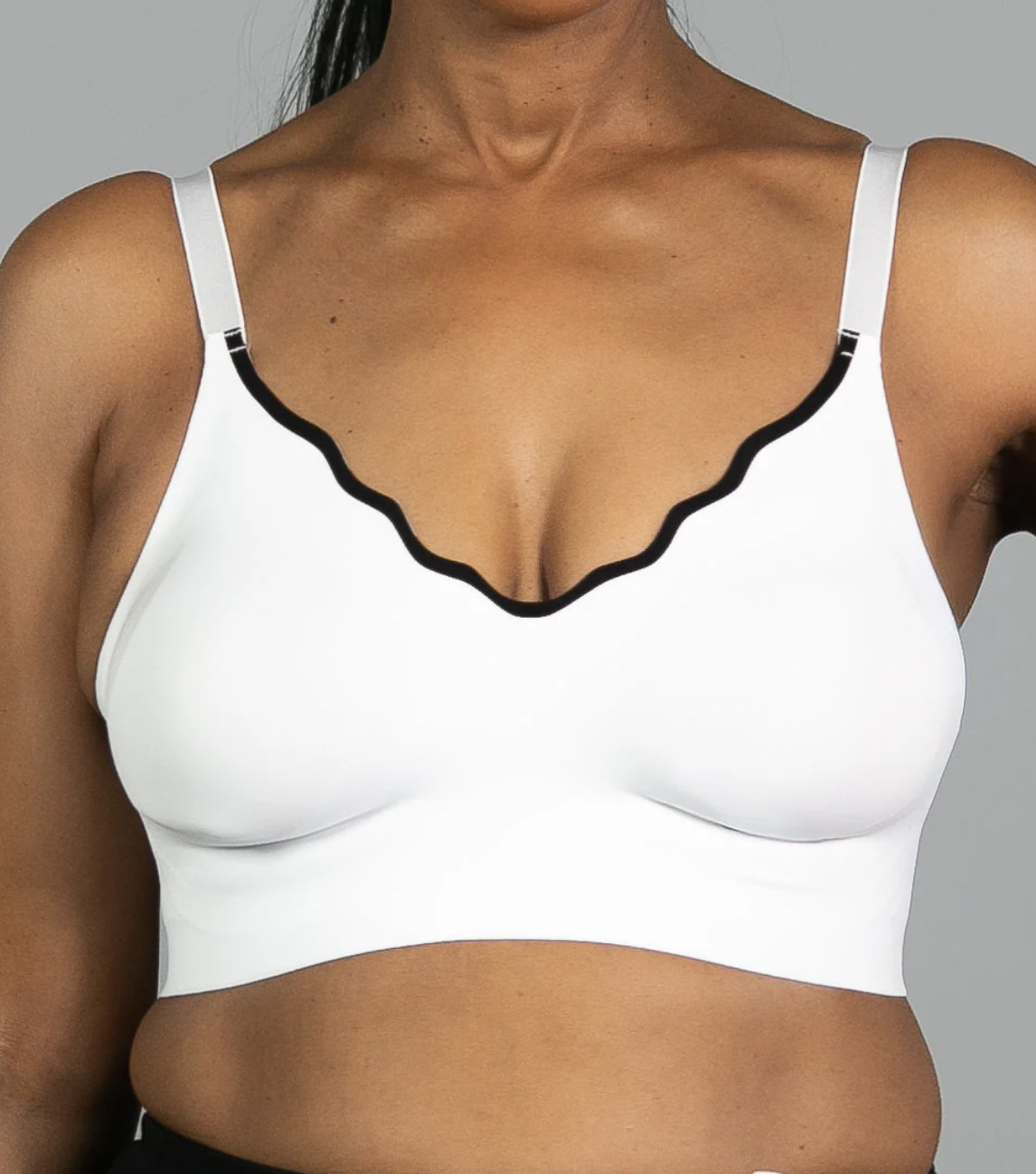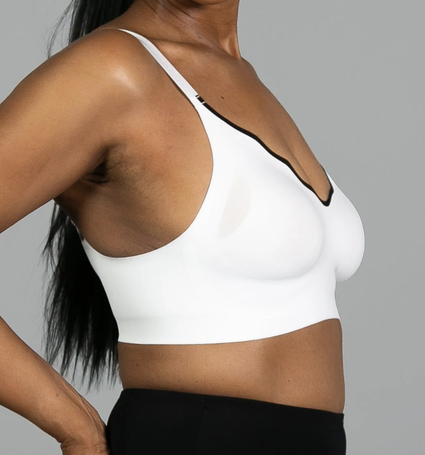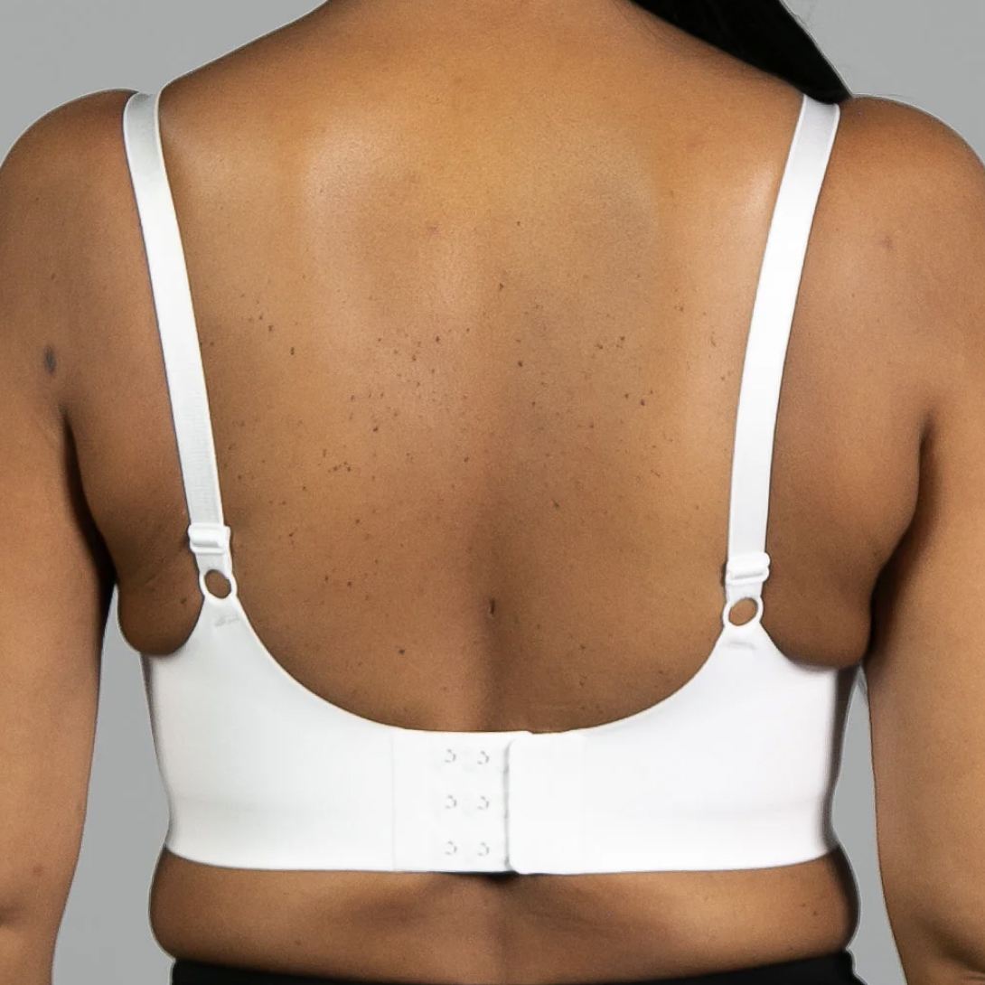 Invisible edge, stretch bra designed with a bonded under-bust band for comfortable support. Back hook and eye closure. Removable padding. Adjustable shoulder straps.