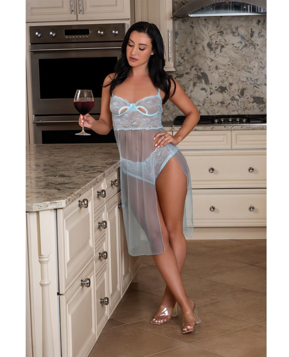 Adorable leopard print babydoll with lace cups and lace trim features a flirtatious flyaway open-back skirt and crisscross straps. Matching G-string included.