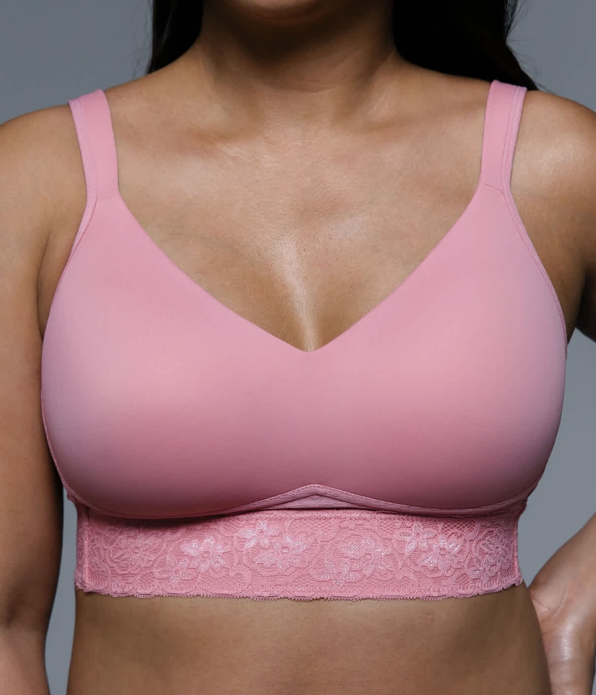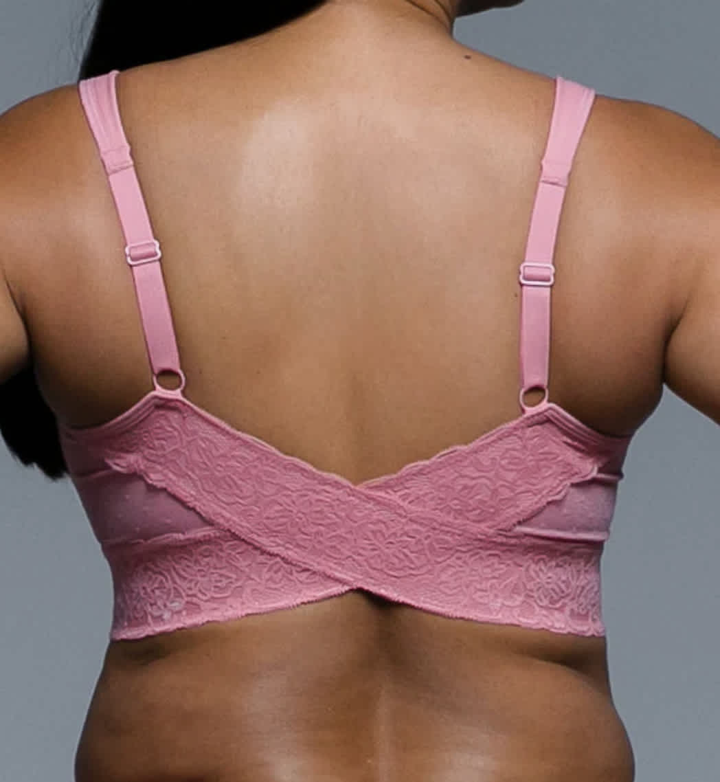 Stretch microfiber wire-free bra with flexible, removable padding. Pull-over design with back lace detail.