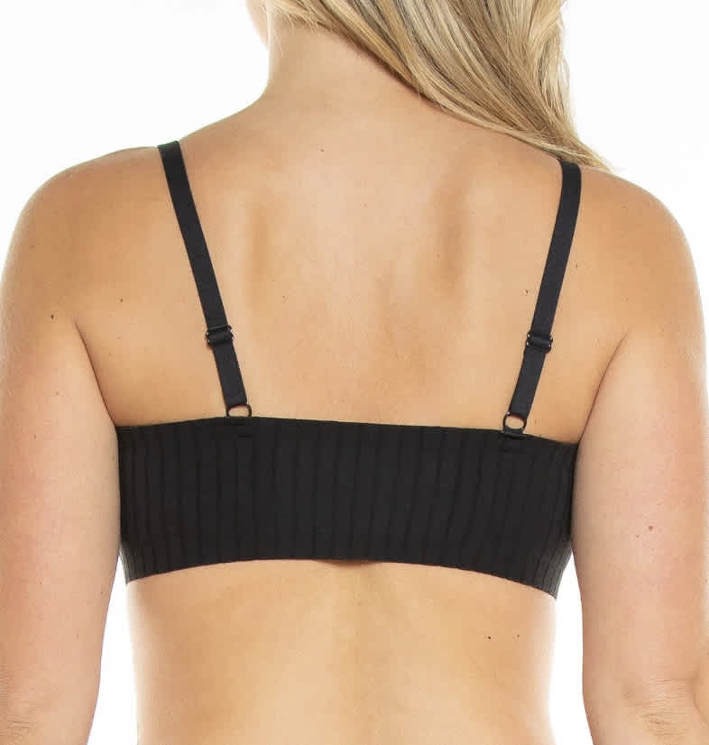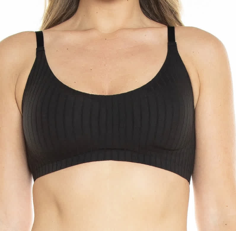 Four-way stretch ribbed knit pull-over bralette with adjustable straps and removable padding.