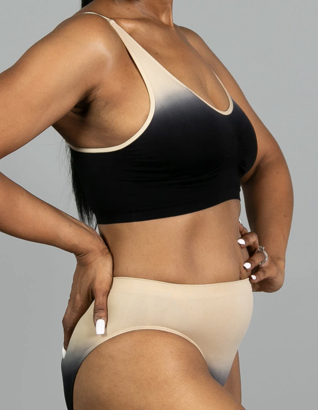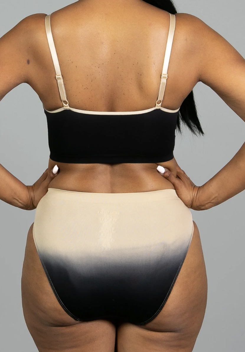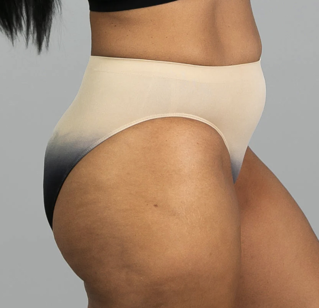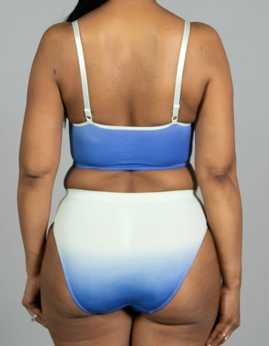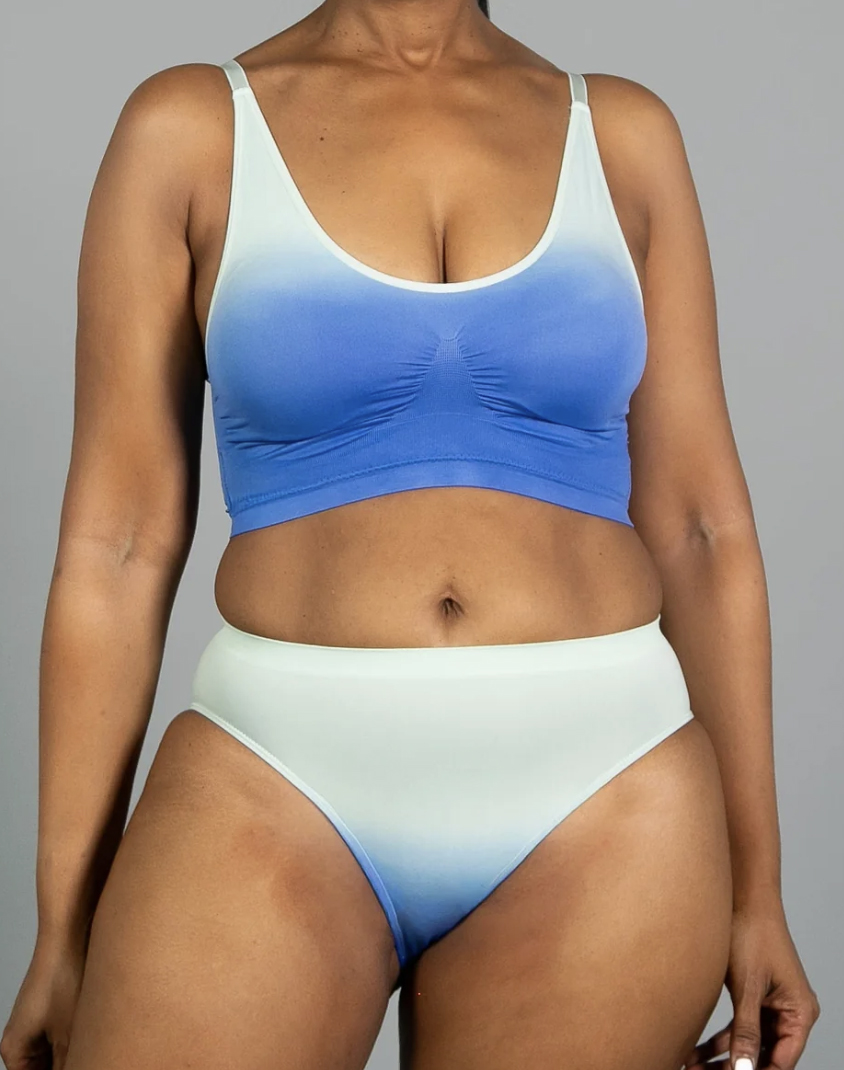 Soft and seamless hi-cut brief with knit-in elastic waist band and wide gusset. Matches the pull-over bralette.